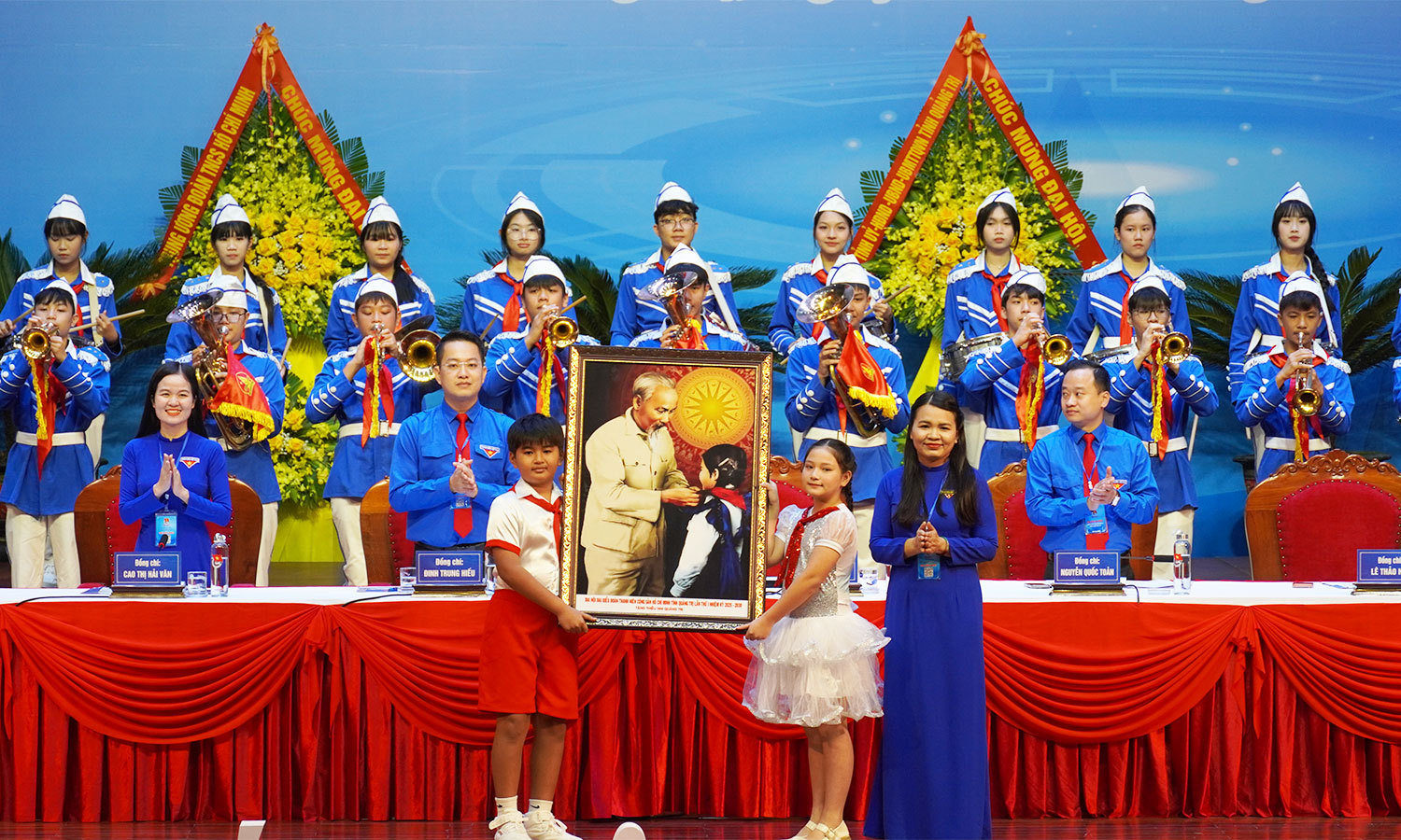 Đồng chí Nguyễn Phạm Duy Trang, Bí thư Ban Chấp hành Trung ương Đoàn, Chủ tịch Đội đồng Đội Trung ương tặng hoa chúc mừng đại hội