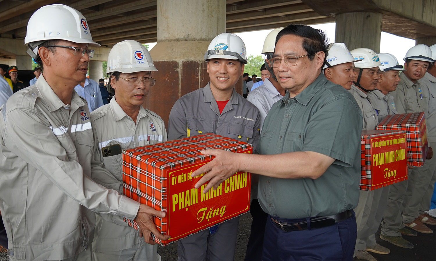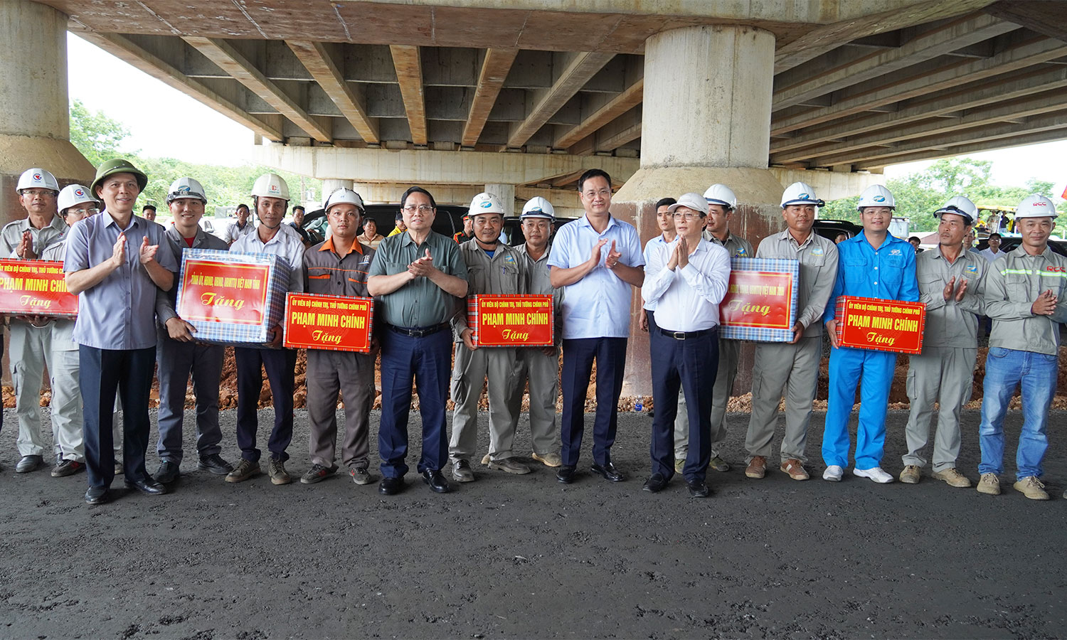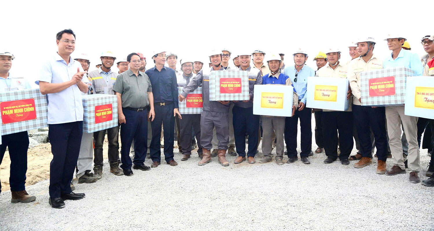 Thủ tướng Phạm Minh Chính tặng quà, thăm hỏi động viên cán bộ công nhân viên đang thi công công trình Đường bộ cao tốc Bắc Nam phía Đông, đoạn Vạn Ninh - Cam Lộ