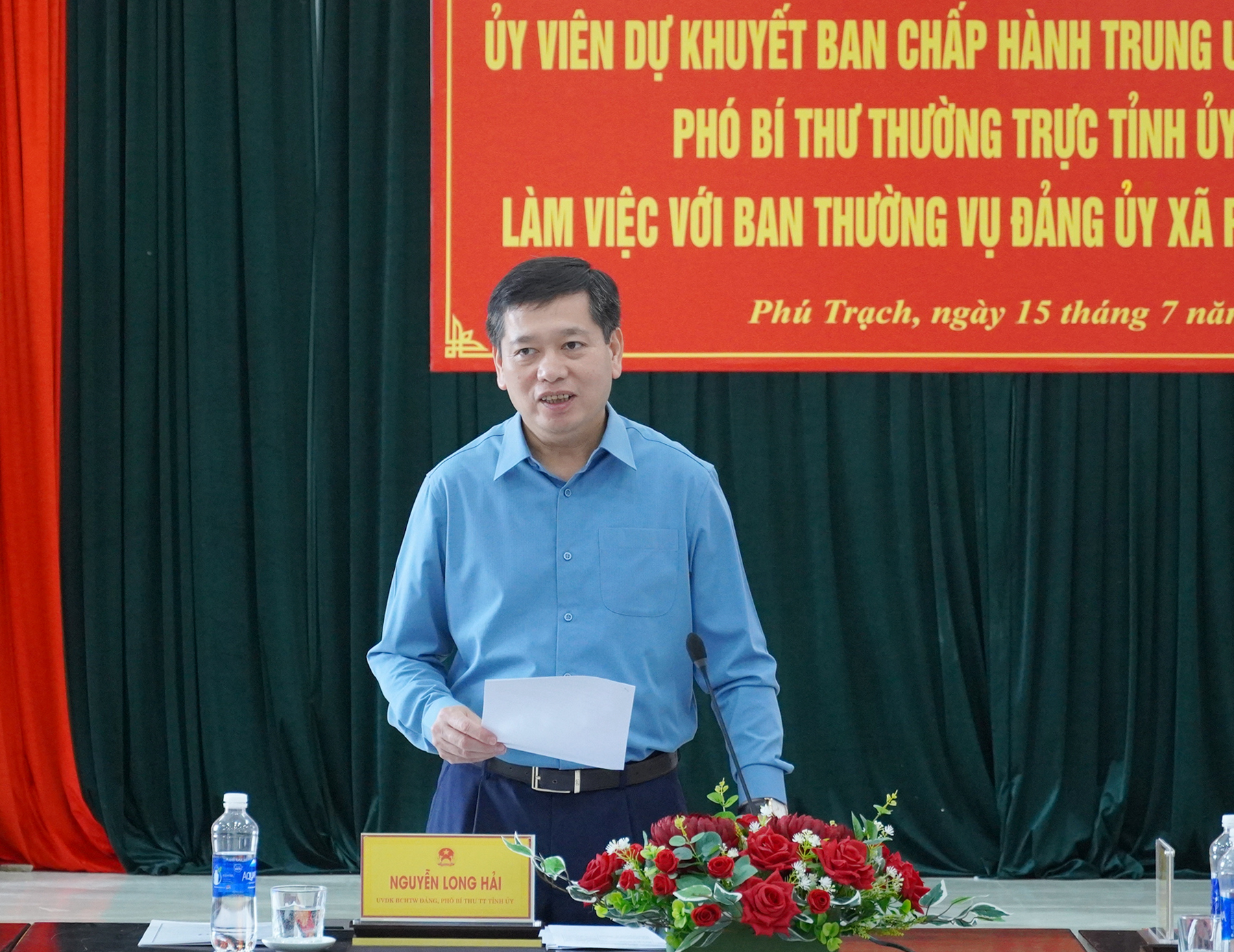 Phát biểu tại buổi làm việc, Phó Bí thư Thường trực Tỉnh ủy Nguyễn Long Hải ghi nhận sự nỗ lực, tinh thần trách nhiệm cao của Đảng ủy, HĐND và UBND xã trong điều kiện còn nhiều khó khăn. Để tiếp tục thực hiện tốt nhiệm vụ được giao, đồng chí yêu cầu xã Phú Trạch tiếp tục rà soát, kiện toàn tổ chức bộ máy các cơ quan Đảng, chính quyền, Mặt trận và các đoàn thể; sớm ban hành và điều chỉnh quy chế làm việc phù hợp với mô hình mới. Tập trung hoàn thiện hồ sơ quy hoạch phát triển kinh tế - xã hội giai đoạn 2025 - 2030, khai thác hiệu quả tiềm năng vùng biển, rừng, du lịch tâm linh và khu công nghiệp. Đẩy mạnh cải cách hành chính, hiện đại hóa nền hành chính, nâng cao chất lượng dịch vụ công, đặc biệt là tại Trung tâm Phục vụ Hành chính công xã. Nâng cao năng lực, trách nhiệm đội ngũ cán bộ, công chức; thực hiện đào tạo, bồi dưỡng theo hướng chuyên nghiệp, chuyên sâu và gắn với vị trí việc làm. Tăng cường công tác dân vận, nắm bắt tư tưởng Nhân dân, giải quyết kịp thời kiến nghị, nguyện vọng chính đáng, tạo sự đồng thuận sau sáp nhập. Thực hiện tốt chính sách an sinh xã hội, giảm nghèo bền vững, chăm lo cho người có công và các đối tượng yếu thế. Giữ vững quốc phòng - an ninh, đảm bảo an toàn tuyệt đối các mục tiêu trọng điểm, không để phát sinh điểm nóng trên địa bàn.