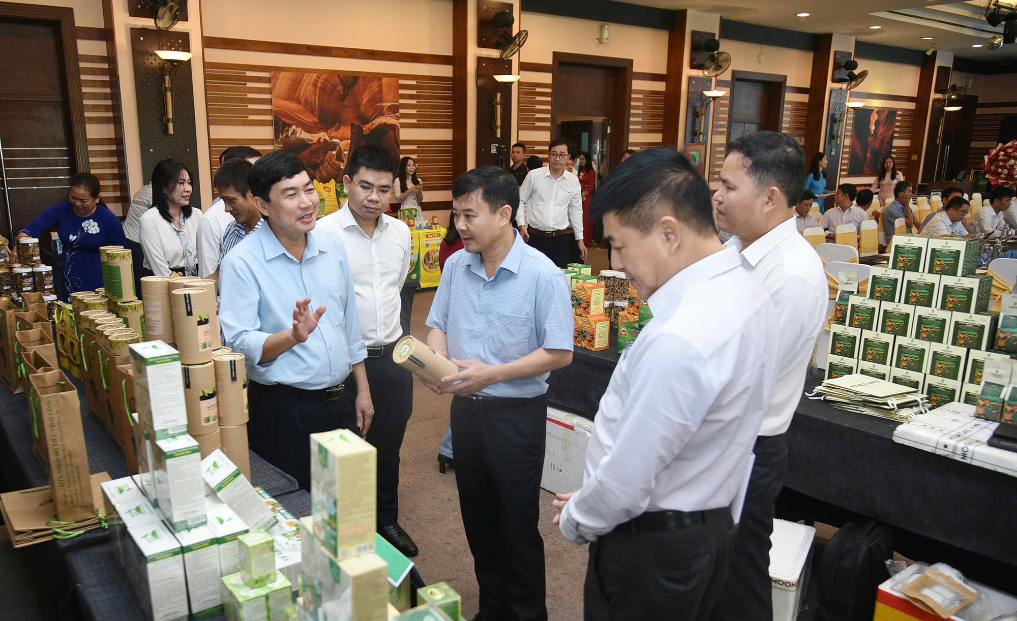 Các đại biểu tham quan các gian hàng nông sản tiêu biểu của tỉnh Quảng Trị được bố trí tại khu vực diễn đàn