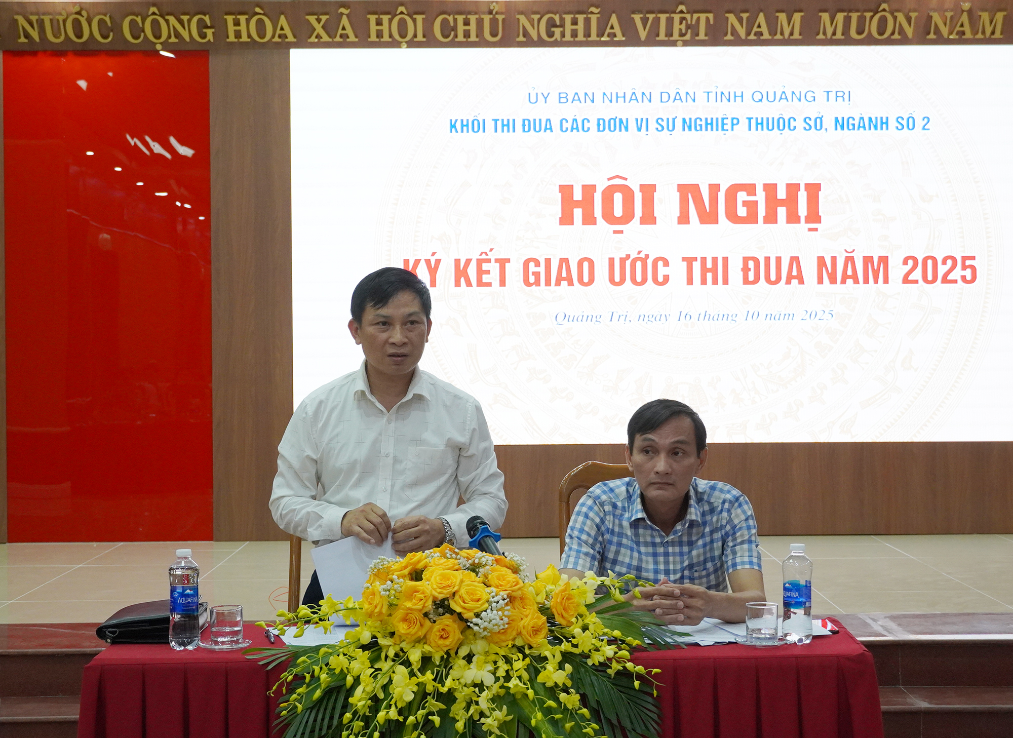 Chiều 16/10/2025, Khối thi đua các đơn vị sự nghiệp thuộc sở, ngành số 2 đã tổ chức hội nghị ký kết giao ước thi đua năm 2025. Đồng chí Lê Hoàng, Giám đốc Trung tâm Điều hành thông tin tỉnh, Trưởng Khối thi đua; đồng chí Lê Bá Hải, Phó Giám đốc Trung tâm Đào tạo và Sát hạch lái xe Quảng Trị, Phó Trưởng Khối thi đua đồng chủ trì hội nghị.