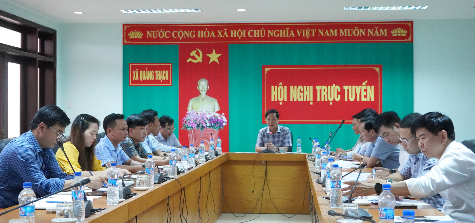 Sau khi kiểm tra thực tế tình hình DTLCP tại hộ chăn nuôi lợn của gia đình bà Đoàn Thị Hương (thôn Vân Tiền, xã Trung Thuần) và đến xem xét điểm tiêu hủy động vật trên địa bàn xã Trung Thuần, Phó Chủ tịch Thường trực UBND tỉnh Hoàng Nam đã chủ trì cuộc họp tại điểm cầu xã Quảng Trạch và trực tuyến với các xã đang có dịch và thuộc nhóm nguy cơ cao.
