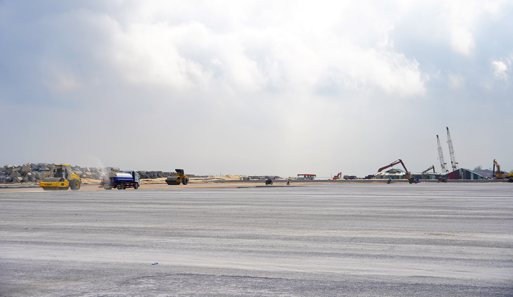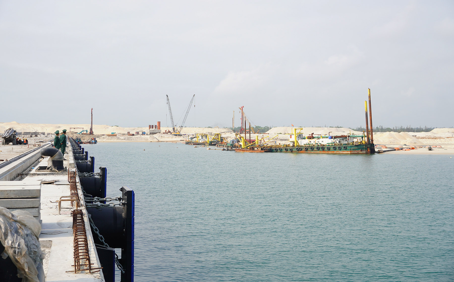 Đến nay, khu bến số 1 và số 2 đã hoàn thành thi công cọc khoan nhồi và hệ dầm, bê tông sàn bến đạt khoảng 70%; dự kiến hoàn thành thi công bến số 1 và số 2 trong tháng 3/2026 và đưa vào vận hành, khai thác 1 bến trong tháng 4/2026. Về hạng mục Đê chắn sóng có chiều dài khoảng 1.735 m; hiện đã thi công đạt trên 1.200 m, dự kiến hoàn thành trong tháng 12/2026. Vũng quay tàu cũng đang được triển khai thực hiện theo kế hoạch.