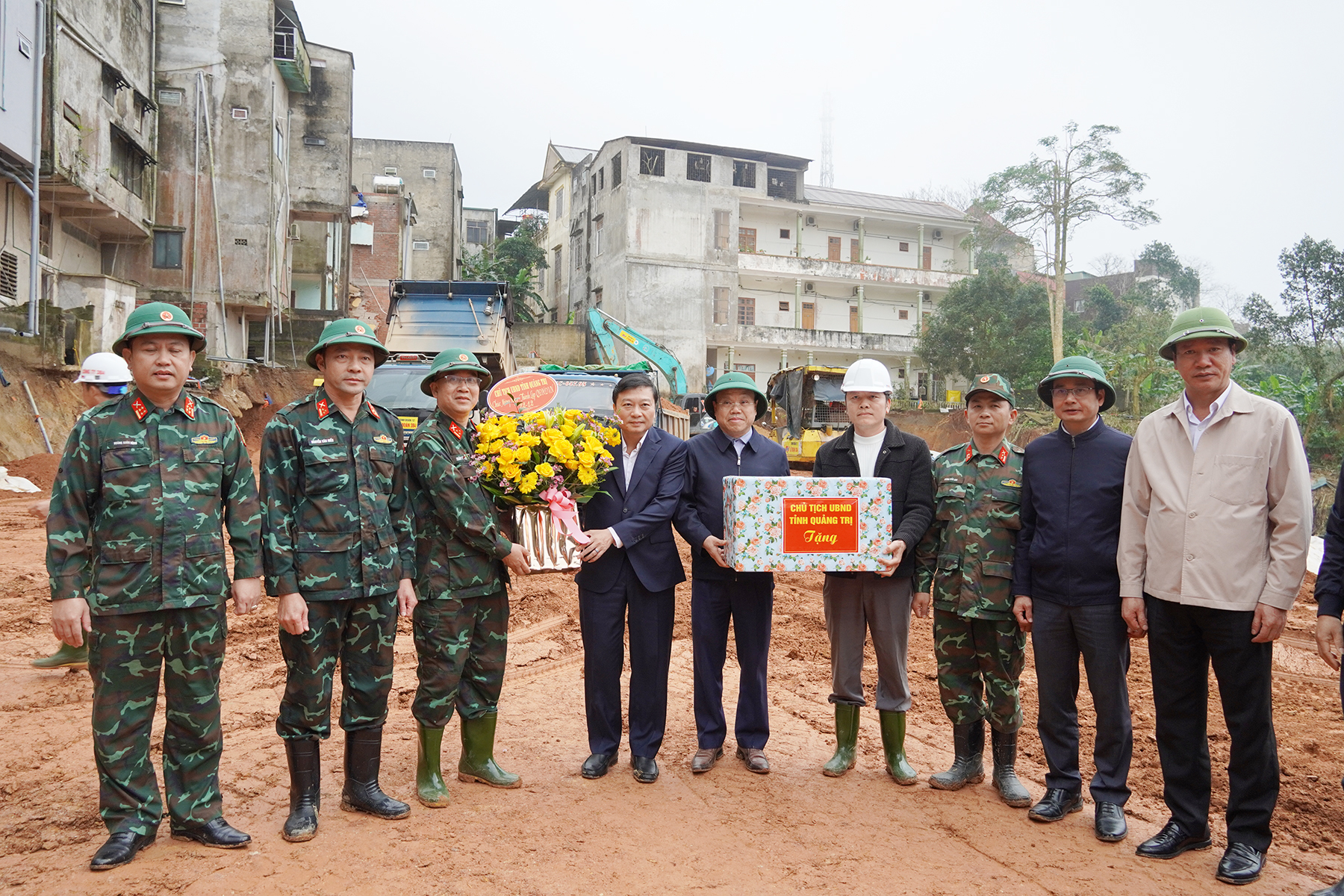 Nhân dịp kỷ niệm 81 năm Ngày thành lập Quân đội nhân dân Việt Nam (22/12/1944 - 22/12/2025) và 36 năm Ngày Quốc phòng toàn dân (22/12/1989 - 22/12/2025), Chủ tịch UBND tỉnh cũng đã có những phần quà động viên lực lượng quân đội đang trực tiếp thi công tại công trình sụt trượt ở khu vực đường Hùng Vương tại thôn 3A, xã Khe Sanh