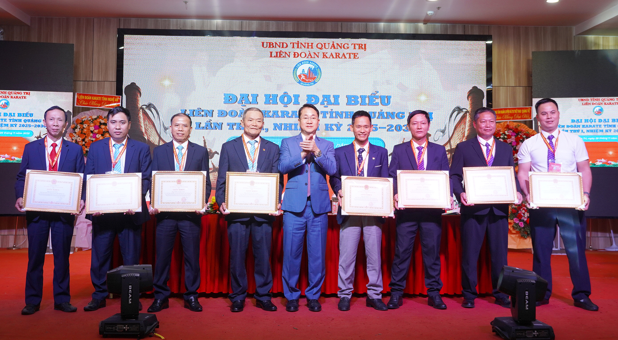 Nhân dịp này, Cục trưởng Cục Thể thao Việt Nam đã tặng Giấy khen cho 8 cá nhân có thành tích xuất sắc đóng góp trong công tác tổ chức, huấn luyện, phát triển phong trào Karate tại địa phương và khu vực miền Trung giai đoạn 2020 - 2025; Liên đoàn Karate tỉnh Quảng Trị tặng Giấy khen cho 6 tập thể, 10 cá nhân vì có thành tích trong công tác xây dựng và phát triển Liên đoàn.