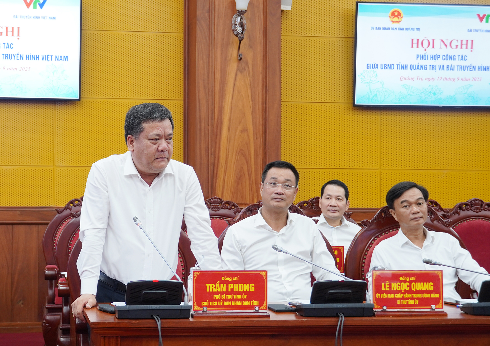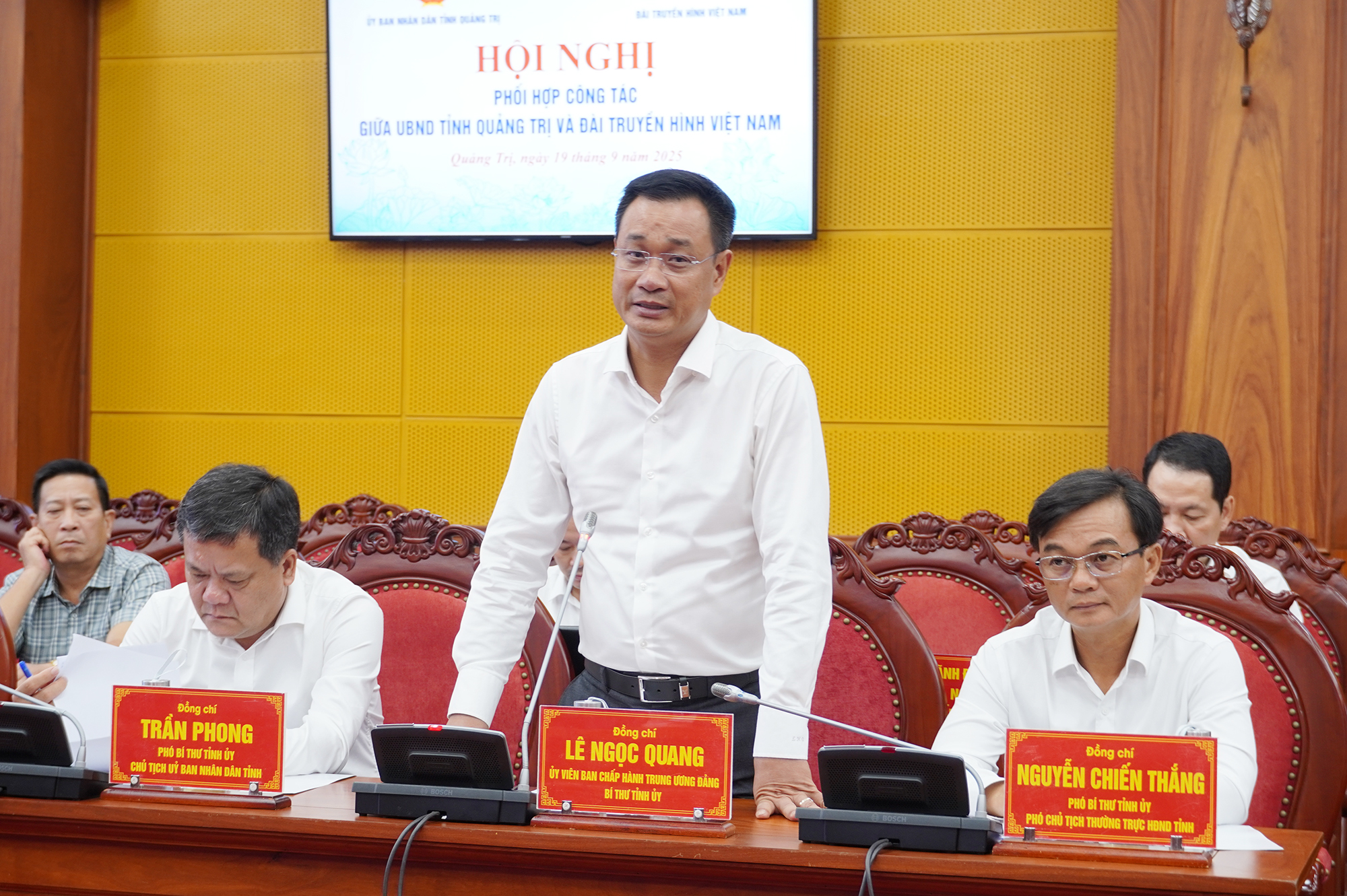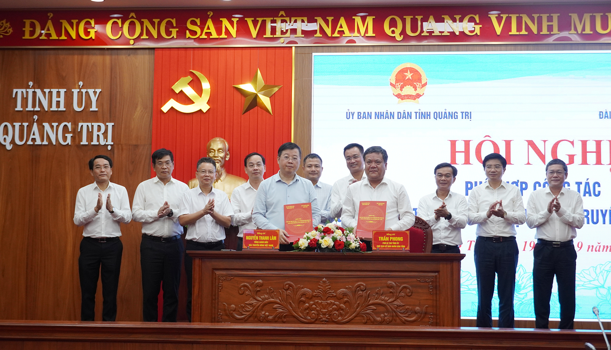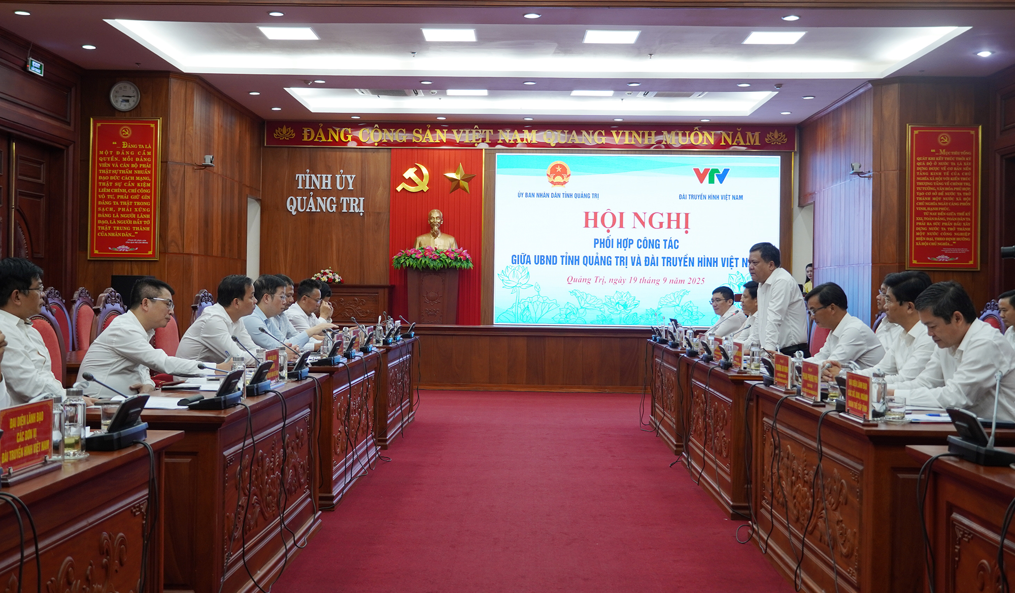 Chiều 19/9/2025, tại phường Đồng Hới, UBND tỉnh và Đài Truyền hình Việt Nam tổ chức hội nghị phối hợp công tác và ký kết Chương trình phối hợp giai đoạn 2025 - 2030. Dự hội nghị có Ủy viên Trung ương Đảng, Bí Thư Tỉnh ủy Lê Ngọc Quang; Chủ tịch UBND tỉnh Trần Phong cùng các đồng chí trong Ban Thường vụ Tỉnh ủy, Thường trực HĐND, UBND, Ủy ban MTQVN tỉnh và lãnh đạo các sở, ngành liên quan. Về phía Đài Truyền hình Việt Nam có Tổng Giám đốc Nguyễn Thanh Lâm; các đồng chí Phó Tổng Giám đốc và lãnh đạo các ban, trung tâm của Đài.